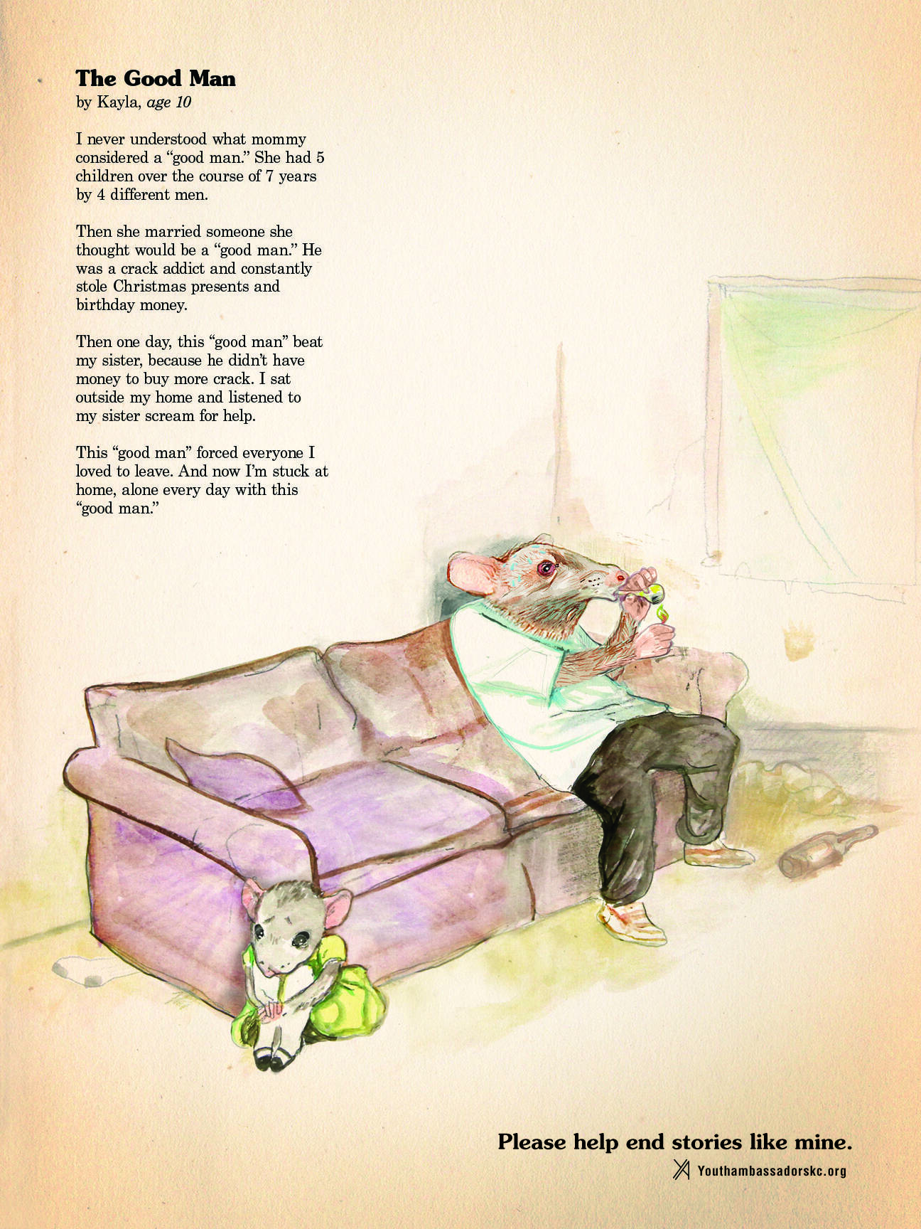 The book consisted of three illustrated bedtime stories, each telling a different child’s story — one of drug abuse, one of violence and one of hunger. Each horrific yet true story came to life using the child’s own words, but was put into a format everyone could relate to. It was a book written by children, yet not suitable for children.